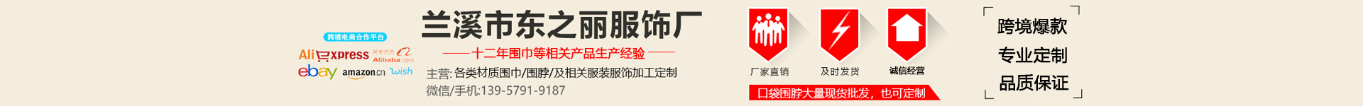 兰溪市东之丽服饰厂,专业承接围巾外贸订单,我厂已有15年定制生产经验,主...